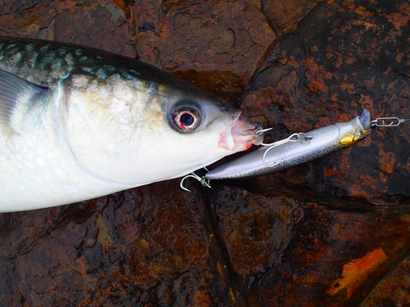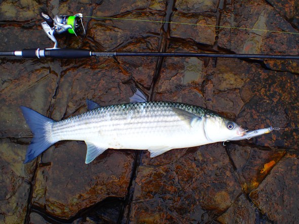 Arrived and the water was already much higher than I expected and I thought I must have mis-read the tables so I tackled up and hurriedly got going. It was still dark when I started but you could see there was a nice little chop to the water. Nothing at the first couple of spots so I gradually made my way west along the shoreline switching lures in the process and it was after one of these changes to the smaller Tackle House Feed Shallow 105 that just as the light was up I got hit… for all the world I thought I’d got lucky with an early season bass but was beyond surprised when I saw it was a mullet!