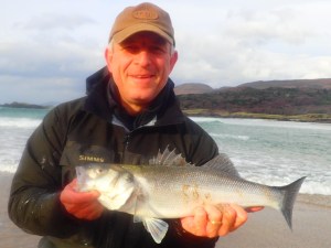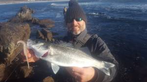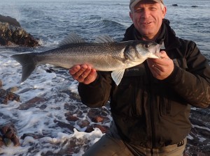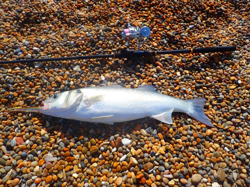 Buoyed by seeing more plentiful signs of life on the south coast on day four, Nobby and I decided to start there on day five… flogging the west and it’s challenging conditions as we had for a majority of the time on previous days was bearing little fruit. You can’t ignore the signs, and that coupled with the lures spending more time working properly in the south coast waters it seemed a more logical approach. We returned to a similar area of the coast I’d picked up a nice 5lb fish the previous day and by the time we got there the tide had just about turned with the first of the flood. We began fishing a bit earlier in the coastline compared to where we had started the previous day and steadily worked ourselves along the water. It was rougher than the previous day but eminently fishable… I was fishing a small boulder ridden bay and about 100 yards away Nobby had perched himself up on a higher rock in an elevated position above the water surface.